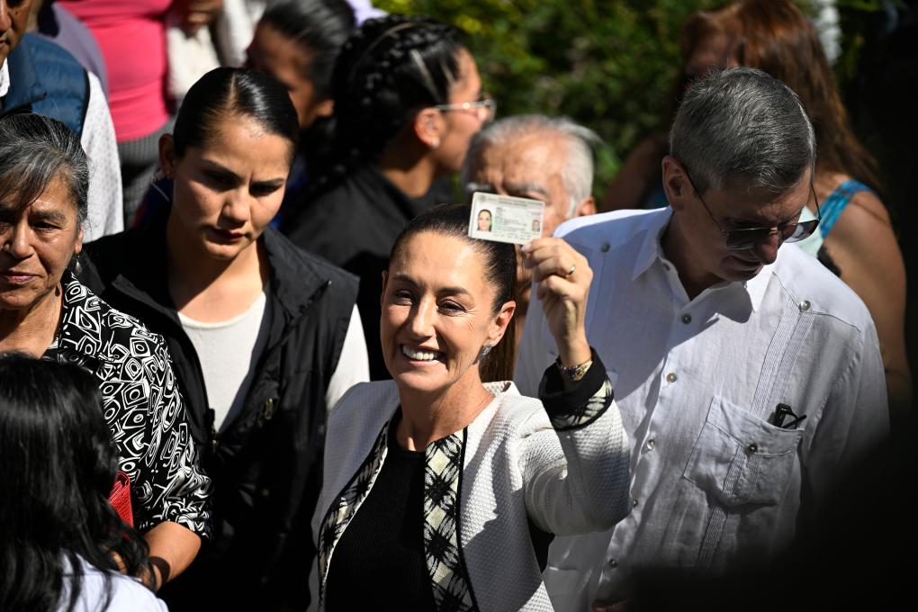 6月2日,在墨西哥首都墨西哥城一處投票站,辛鮑姆展示選民證。新華社記者李木子攝