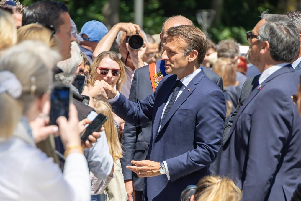 6月9日,在法國勒圖凱市一處投票站外,法國總統馬克龍(右二)在參加歐洲議會選舉投票前與民眾交流。新華社發(弗蘭克·博阿姆攝)