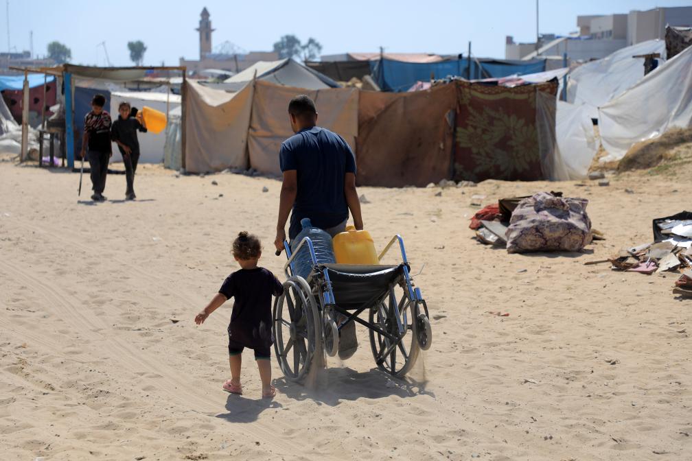 6月10日,流離失所的人們在加沙地帶汗尤尼斯馬瓦西地區的臨時營地搬水。新華社發(里澤克·阿卜杜勒賈瓦德攝)