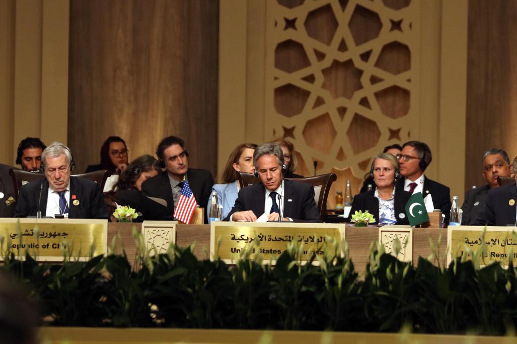 6月11日,在約旦侯賽因國王會議中心,美國國務卿布林肯(前左二)出席加沙緊急人道主義應對會議。新華社發(穆罕默德·阿布·古什攝)