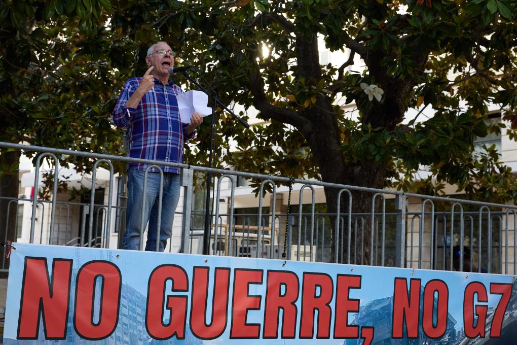 6月13日,在距七國集團峰會會場60公里的意大利布林迪西市,一名抗議者發表演說抗議七國集團峰會。新華社記者孟鼎博攝