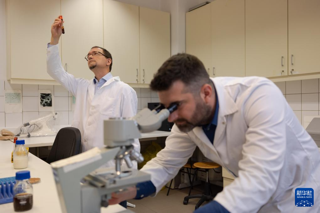 5月27日,在匈牙利布達佩斯,匈牙利農業與生命科學大學研究員海吉·費倫茨(前)、佐蘭·若爾特在實驗室工作。 新華社發(弗爾季·奧蒂洛攝)
