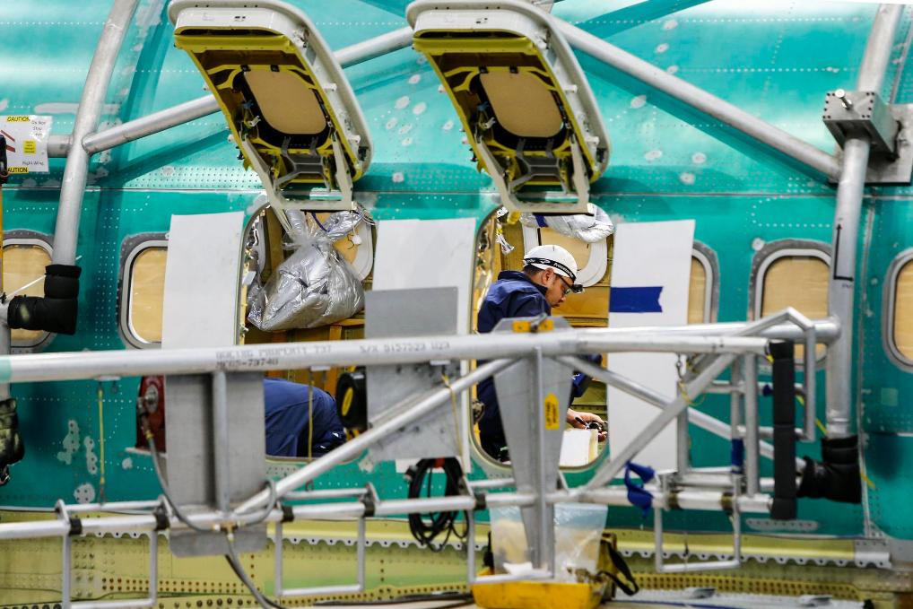 2014年9月26日,工人們在美國華盛頓州波音埃弗里特工廠的737單通道飛機生產線上工作。新華社記者張玉薇攝