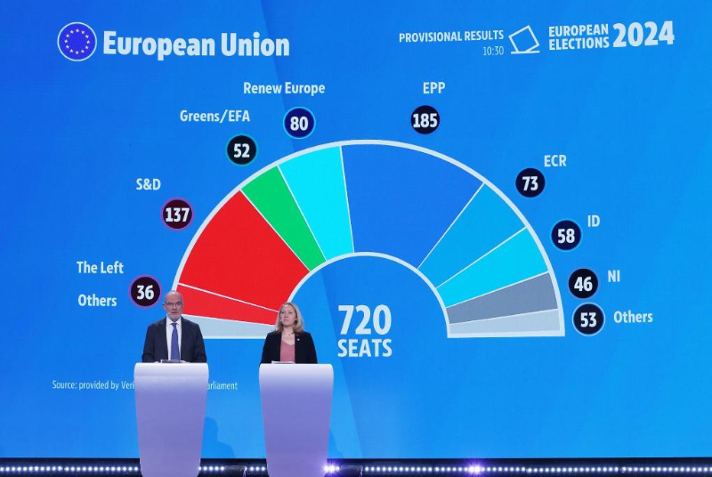 這是6月10日在位于比利時布魯塞爾的歐洲議會拍攝的選舉臨時結果。新華社記者趙丁喆攝