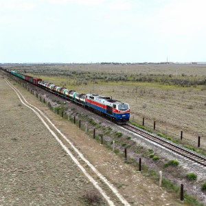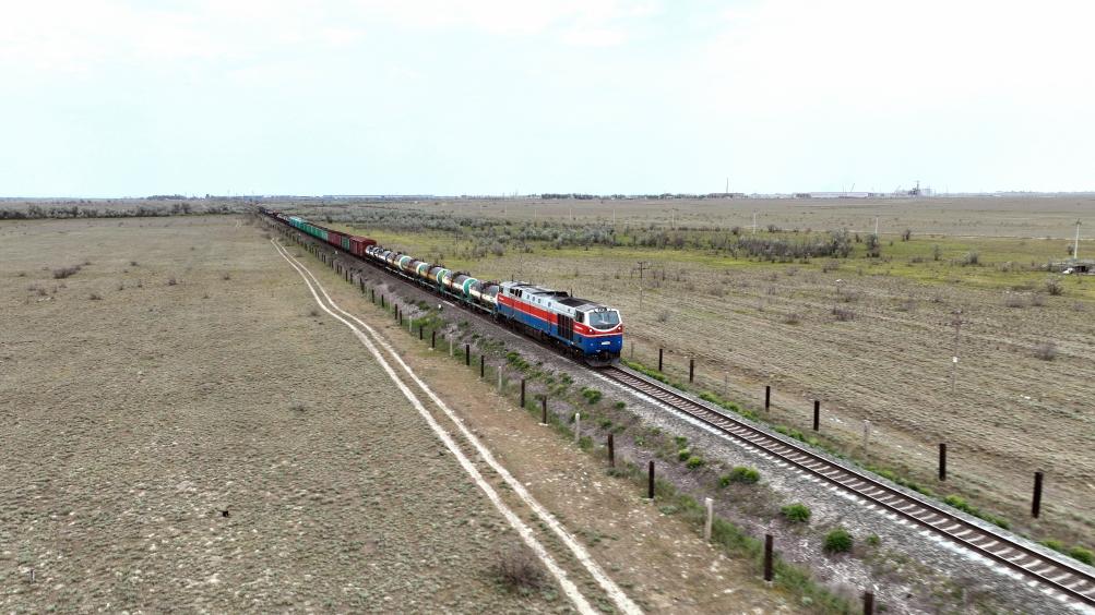 2023年5月12日,在哈薩克斯坦阿拉木圖附近,貨運列車馳騁于阿拉木圖與中國霍爾果斯間(無人機照片)。新華社發(奧斯帕諾夫攝)