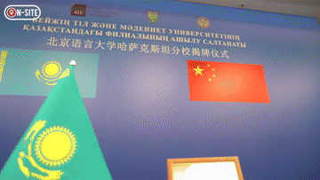 3日,阿斯塔納總統府,在兩國元首見證下,北京語言大學校長段鵬和合作伙伴哈薩克斯坦阿斯塔納國際大學校長伊爾薩利耶夫一同將紅色蓋布掀起,為分校揭牌。