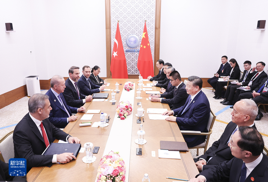 當地時間7月4日下午,國家主席習近平在阿斯塔納出席上海合作組織峰會期間會見土耳其總統埃爾多安。