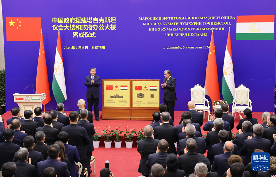新華社杜尚別7月5日電(記者孫奕 陳杉)當地時間7月5日下午,國家主席習近平同塔吉克斯坦總統拉赫蒙在杜尚別共同出席中方援塔議會大樓和政府大樓落成儀式。