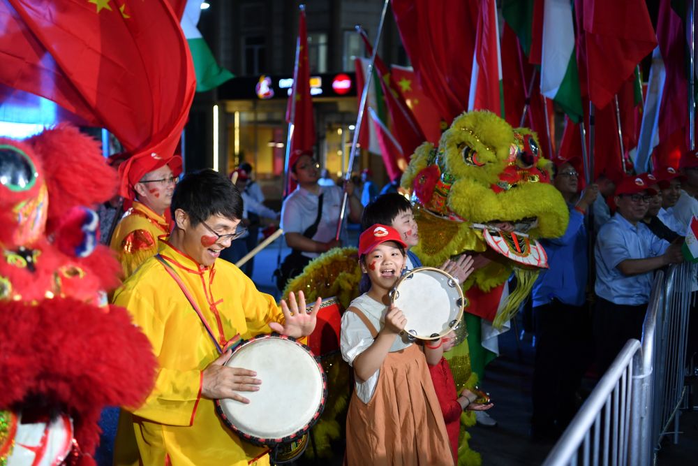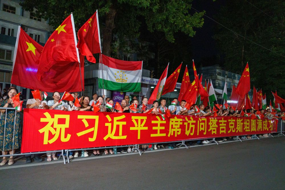 1500多名身著民族盛裝的塔吉克斯坦青年表演富有濃郁特色的中塔歌舞,揮舞中塔兩國國旗,表達對中國最尊貴客人的熱烈歡迎。