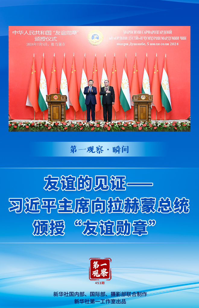 “今天我們舉行隆重儀式,向中國人民的老朋友——塔吉克斯坦總統拉赫蒙閣下頒授中華人民共和國對外最高榮譽勛章——‘友誼勛章’?!?/p>