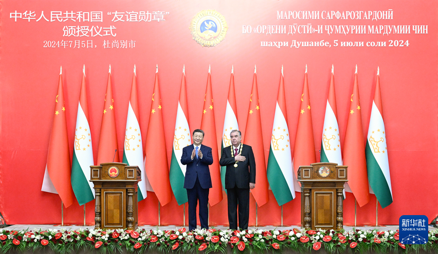 新華社杜尚別7月5日電(記者鄭開君 史霄萌)當地時間7月5日下午,國家主席習近平在杜尚別總統府舉行隆重授勛儀式,向塔吉克斯坦總統拉赫蒙頒授“友誼勛章”。