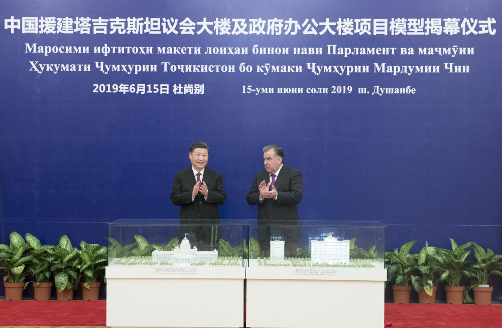 時光回到五年前,2019年6月15日,國家主席習近平在杜尚別同塔吉克斯坦總統拉赫蒙會談。會談后,兩國元首共同出席中方援塔議會大樓、政府辦公大樓項目模型揭幕儀式。