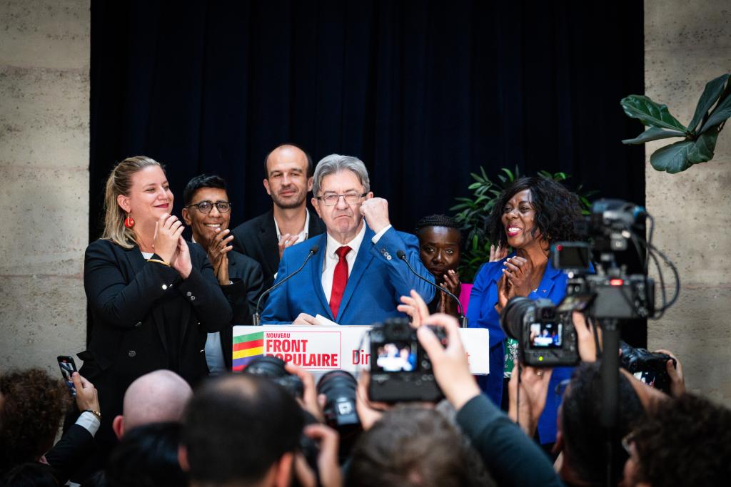 7月7日,法國極左翼政黨“不屈法國”領導人梅朗雄(中)在巴黎出席選后集會。新華社發(何塞·博薩斯攝)