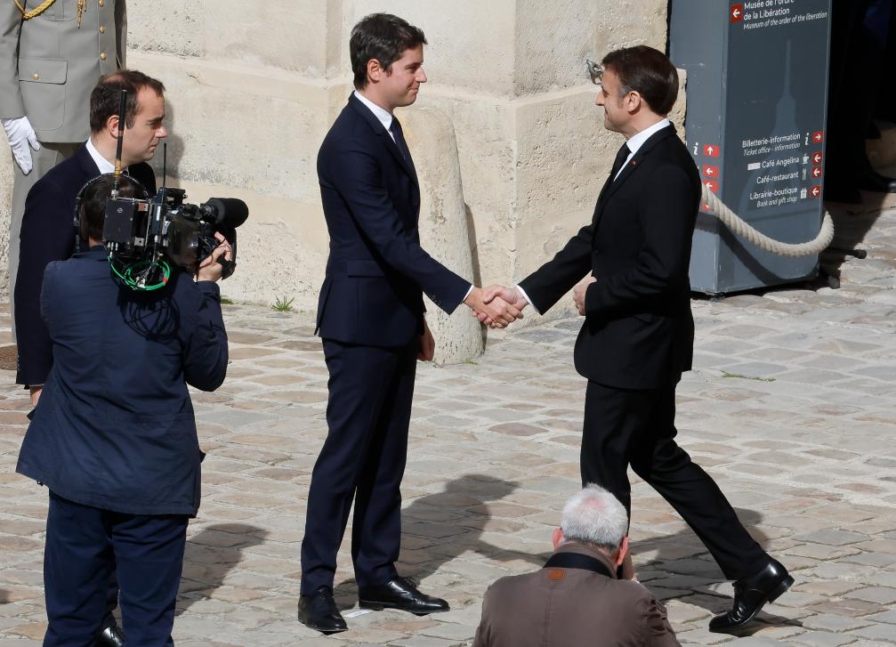 這是2024年3月20日,法國總統馬克龍在巴黎與總理阿塔爾握手的資料照片。新華社發(亨利·施瓦茨攝)