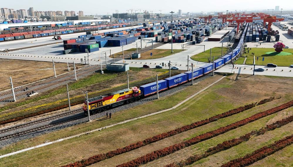 中歐班列從西安國際港站駛出(無人機照片)。新華社記者鄒競一 攝