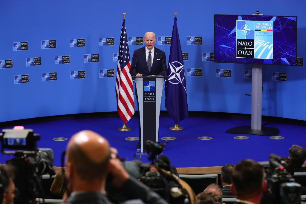 2022年3月24日,美國總統拜登在比利時布魯塞爾的北約總部出席北約特別峰會后的新聞發布會。新華社記者 鄭煥松 攝