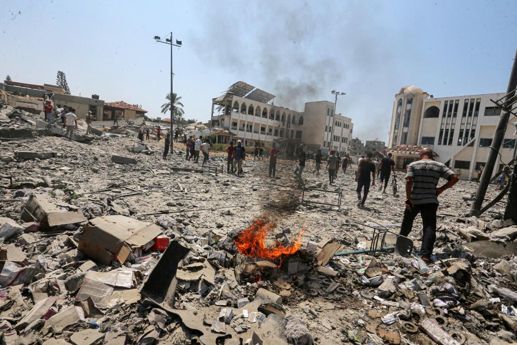 7月27日,巴勒斯坦加沙地帶衛生部門發表聲明說,以色列軍隊當天轟炸加沙地帶中部代爾拜拉赫一家野戰醫院,造成至少30人死亡、超過100人受傷。圖為人們聚集在以軍襲擊現場附近。新華社發(里澤克·阿卜杜勒賈瓦德攝)