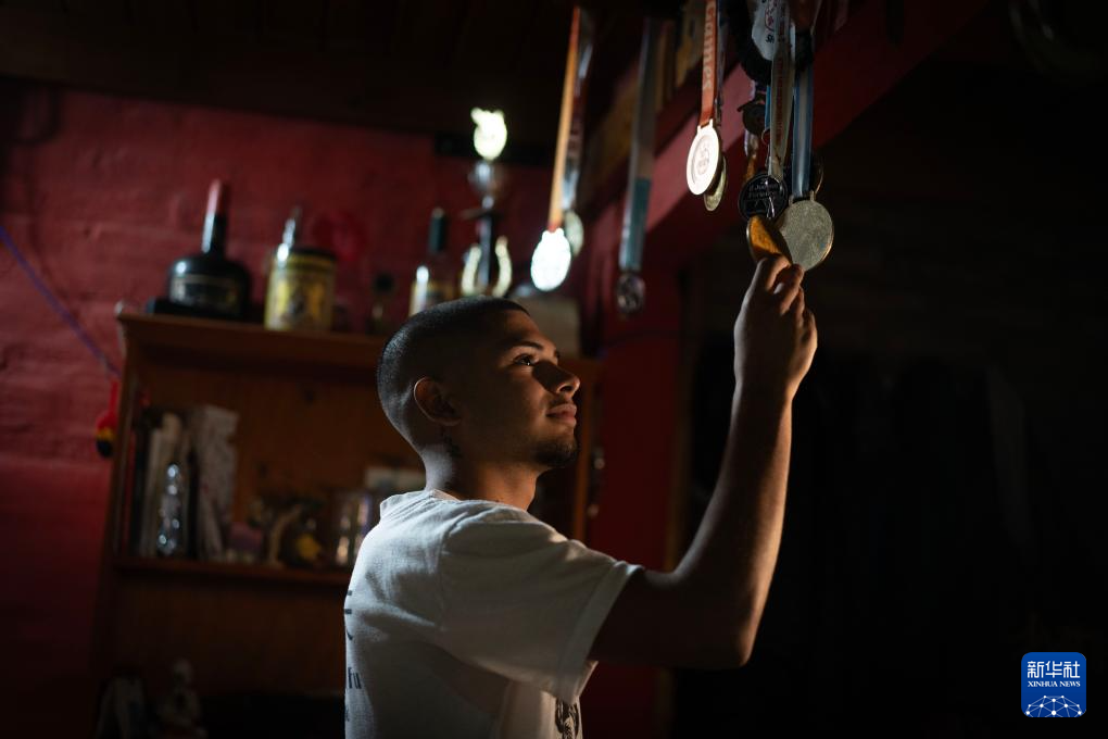 6月17日,阿根廷武術運動員拉米羅·費爾南德斯在位于阿根廷首都布宜諾斯艾利斯南郊的家中向記者展示他所獲得的獎牌。新華社發(馬丁·薩巴拉攝)