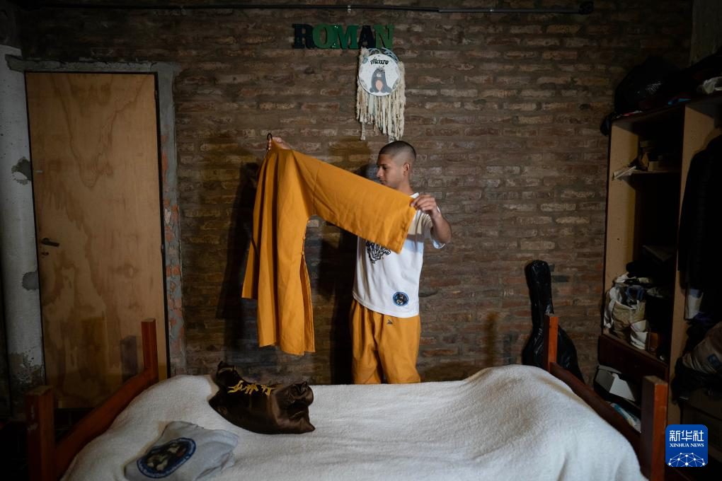 6月17日,阿根廷武術運動員拉米羅·費爾南德斯在位于阿根廷首都布宜諾斯艾利斯南郊的家中更衣。新華社發(馬丁·薩巴拉攝)