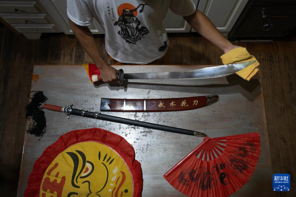 6月17日,阿根廷武術運動員拉米羅·費爾南德斯在位于阿根廷首都布宜諾斯艾利斯南郊的家中整理武術用具。新華社發(馬丁·薩巴拉攝)