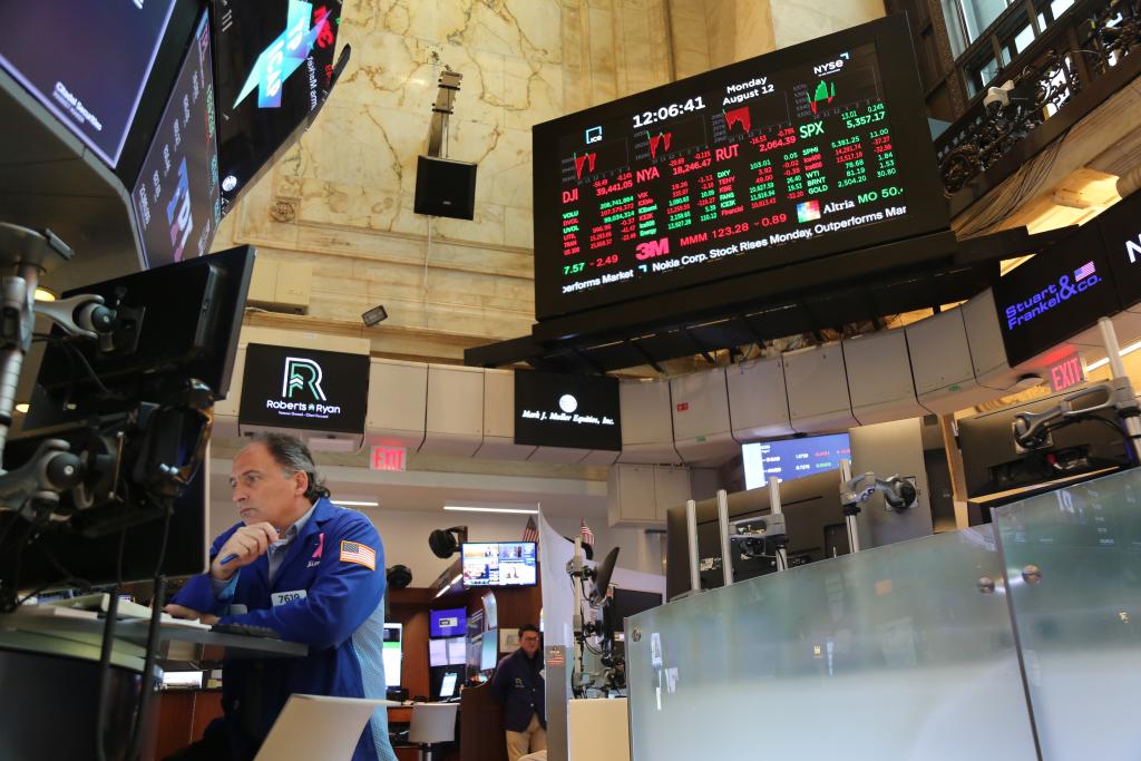 圖為2024年8月12日,交易員在美國紐約證券交易所交易大廳工作。(新華社記者劉亞南攝)