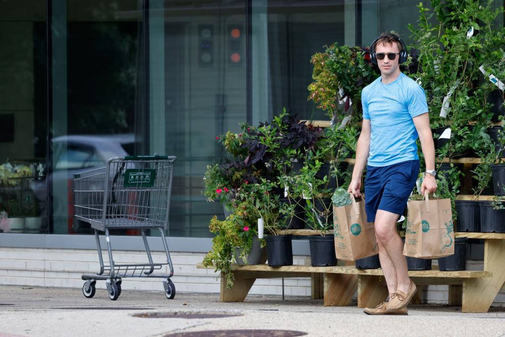 2022年6月14日,在美國華盛頓,一名男子提著購物袋從一家食品超市旁走過。新華社發(沈霆攝)