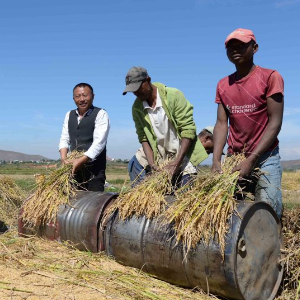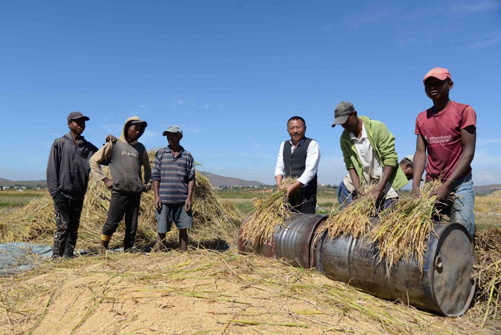 在馬達加斯加首都塔那那利佛附近的馬義奇鎮,中國雜交水稻技術專家胡月舫(右三)在中國國家雜交水稻工程技術研究中心非洲分中心的試驗田里和當地農民一起收獲水稻(2023年5月12日攝)。新華社發(西塔卡·拉喬納里松 攝)