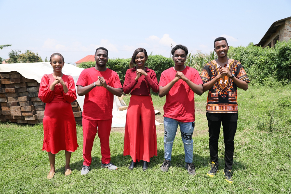 2024年2月7日,在盧旺達南方省卡莫尼地區,盧旺達青年團隊成員向鏡頭前觀眾送上新春祝福。新華社發(黃萬晴 攝)
