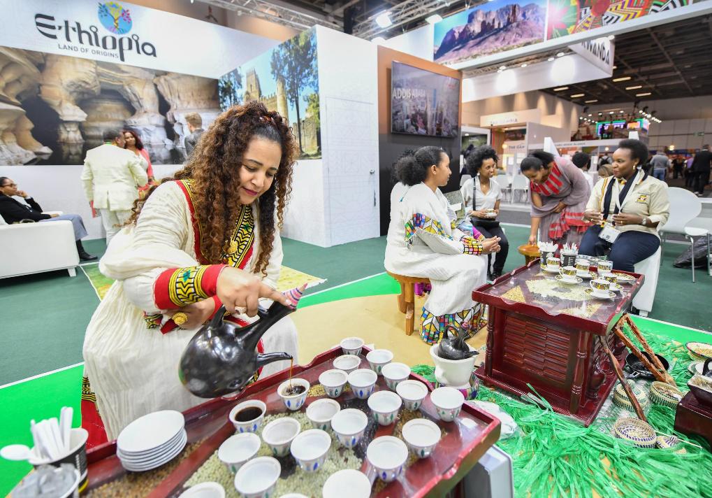 3月5日,在德國柏林舉行的柏林國際旅游交易會埃塞俄比亞展區,工作人員為參觀者制作咖啡。新華社記者任鵬飛攝