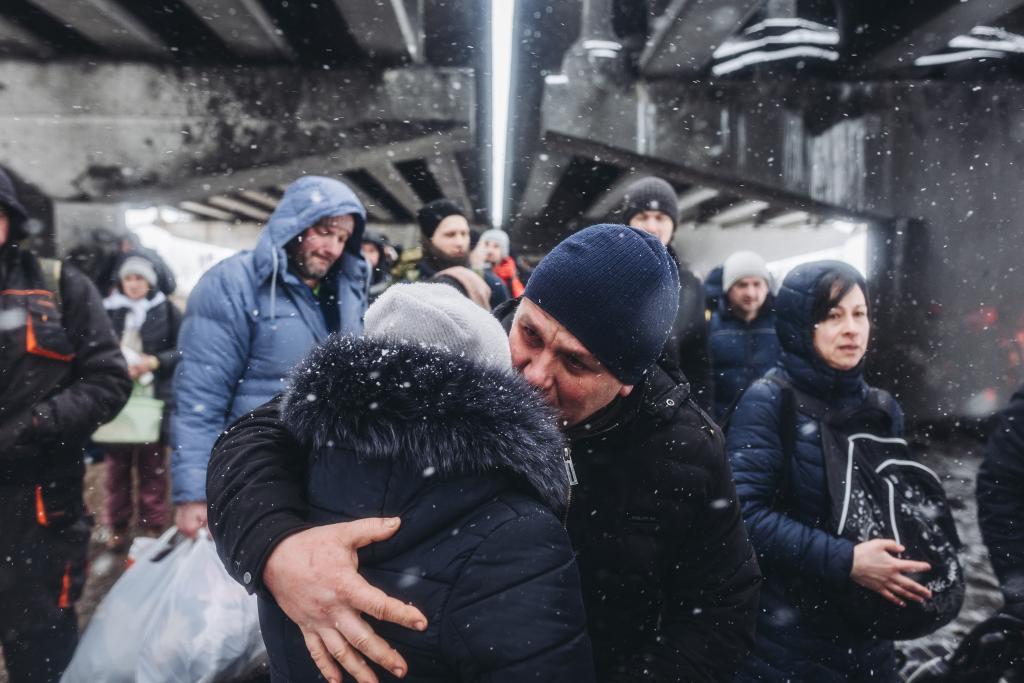 2022年3月8日,一對情侶在烏克蘭伊爾平告別。俄方3月9日在烏克蘭多個城市實行“安靜模式”并開放人道主義通道。新華社發(迭戈·埃雷拉攝)