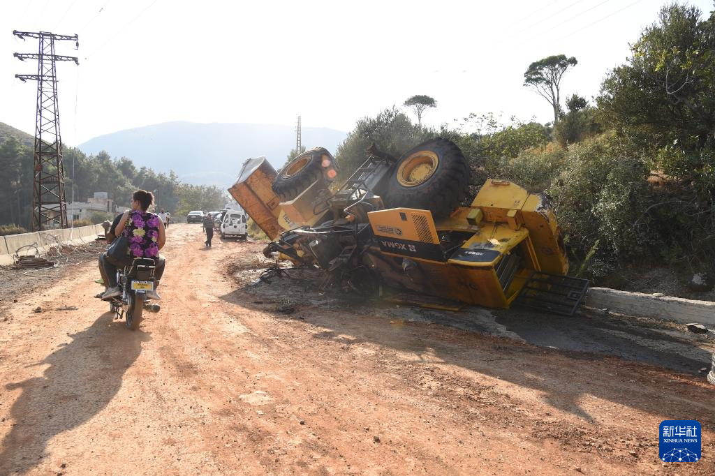 9月9日,在敘利亞中部哈馬省邁斯亞夫地區,一臺挖掘機在空襲后傾覆。新華社發(蒙塞夫·梅馬里攝)
