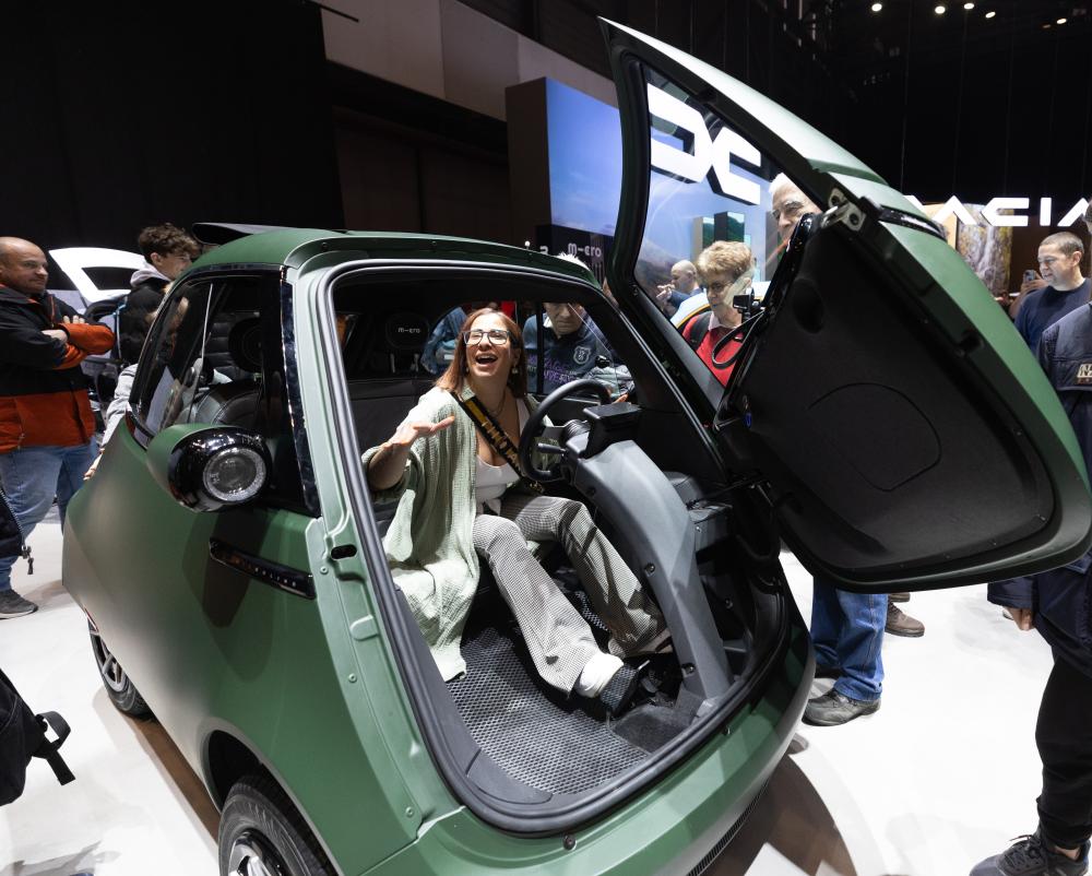2月28日,一名觀眾在瑞士日內瓦舉行的2024年日內瓦國際車展上體驗微型電動汽車。新華社記者孟鼎博攝