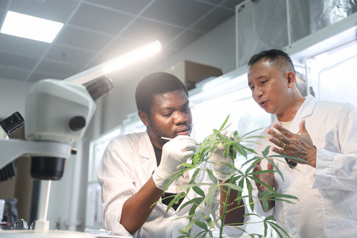 2024年7月17日,在中國熱帶農業科學院三亞研究院內,二級研究員陳青(右)指導尼日利亞留學生格雷戈里開展木薯蟲害綠色防控研究實驗。新華社記者 張麗蕓 攝