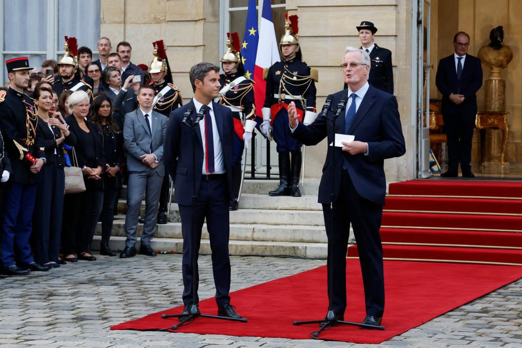 9月5日,在法國首都巴黎的總理府,米歇爾·巴尼耶(前右)和即將卸任的總理阿塔爾(前左)出席交接儀式。新華社發(亨利·施瓦茨攝)