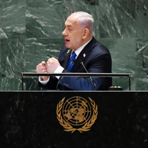 9月27日,在位于紐約的聯合國總部,以色列總理內塔尼亞胡在第79屆聯大一般性辯論上發言。新華社記者 李睿 攝