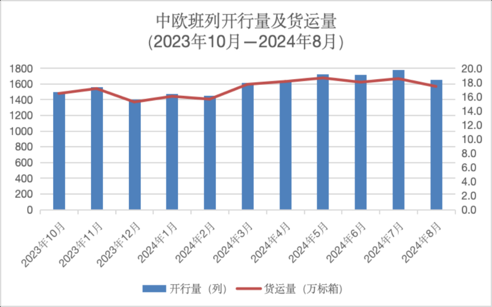 在跨里海國際運輸走廊實現重大進展的推動下,中歐班列持續提質升級,一年來,開列車次、運力運量、覆蓋范圍等指標不斷創下新佳績。2024年1月至8月份,中歐班列累計開行13056列,發送貨物139.9萬標箱,同比分別增長12%、11%,其中8月份開行1653列,發送貨物17.3萬標箱。2024年以來,中歐班列已連續6個月單月開行數量突破1600列。截至2024年7月,中歐班列已通達歐洲25個國家224個城市,連接11個亞洲國家100多個城市,服務網絡基本覆蓋歐亞全境。中國境內已鋪畫時速120公里的圖定中歐班列運行線91條,聯通中國境內61個城市。中歐班列運輸的貨物品類達53大類5萬余種,綜合重箱率穩定在100%。2024年6月,中吉烏鐵路項目三國政府間協定簽署。這條鐵路起自新疆喀什,經吉爾吉斯斯坦進入烏茲別克斯坦境內,未來可向西亞、南亞延伸,建成后不僅將極大促進三國互聯互通,還將有效促進中亞、中歐鐵路通道的聯通發展。