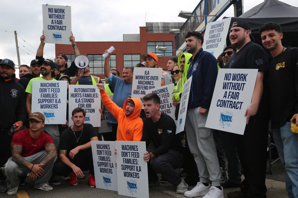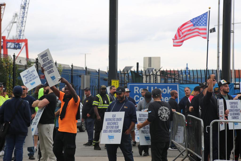 10月1日,美國東海岸和墨西哥灣沿岸30多個碼頭的數萬名工人舉行罷工,要求漲薪,反對港口機械設備自動化。新華社發(勞承躍攝)