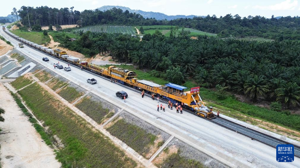 這是5月6日在馬來西亞彭亨州航拍的馬東鐵項目的鋪軌現場。新華社記者 程一恒 攝