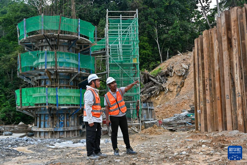 10月11日,在馬來西亞雪蘭莪州,中交馬東鐵項目現場工程師阿茲里爾·哈基姆(左)與馬東鐵鵝嘜車站施工負責人陳威柏(右)在施工現場視察工程。新華社發(張紋綜攝)