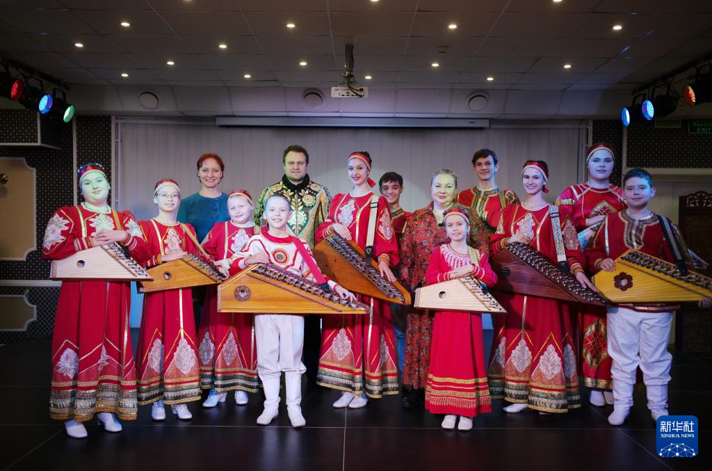 10月14日,在俄羅斯莫斯科州“庫皮納”古斯里琴藝術發展中心音樂廳,“庫皮納”兒童古斯里琴演奏藝術團的演員與俄羅斯音樂家柳博芙·穆拉維約娃(中間一排,右三)合影。