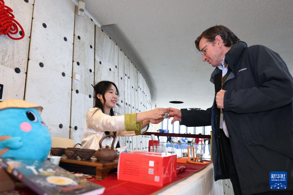 10月28日,在瑞士日內瓦舉辦的“中醫藥走進萬國宮”活動中,一名男子品嘗中國茶。新華社記者 連漪 攝