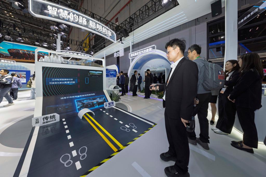 這是11月9日在第七屆進博會立邦展臺拍攝的“智慧路面標識漆”演示效果。新華社記者 王翔 攝
