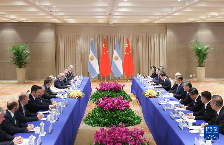 新華社里約熱內盧11月19日電(記者孫浩 朱婉君)當地時間11月19日上午,國家主席習近平在里約熱內盧出席二十國集團領導人峰會期間會見阿根廷總統米萊。