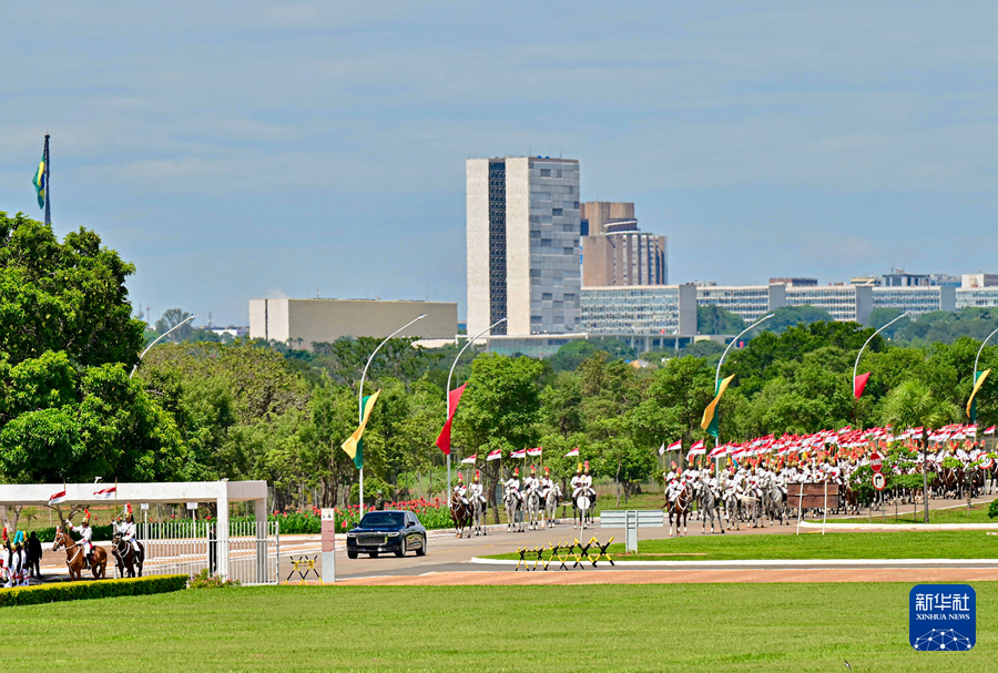 初夏時節的巴西利亞,天朗氣清。黎明宮內,綠草如茵,450名威武禮兵整齊列隊。在120名龍騎兵護衛下,習近平乘車抵達黎明宮前廣場。