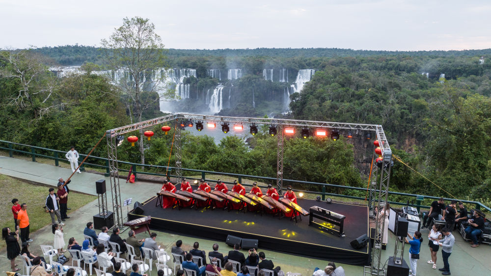 2023年9月29日,演員在巴西伊瓜蘇瀑布前舉行的中秋晚會上演奏古箏,慶祝中國傳統節日中秋佳節。