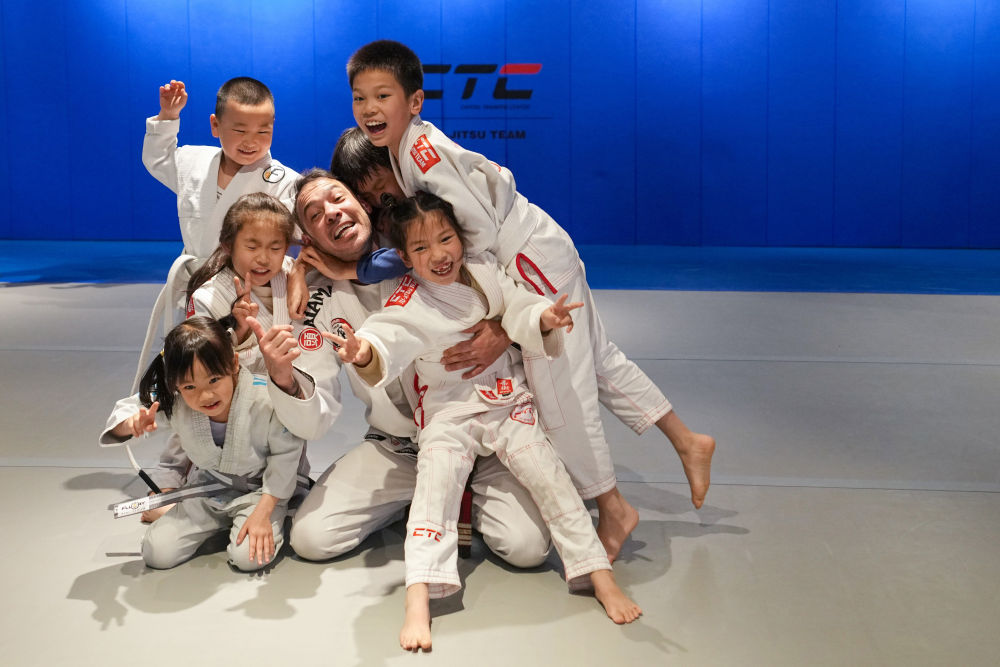 2023年4月7日,在北京一家格斗館內,巴西柔術教練席爾瓦(中)在一堂柔術課結束后與學生們合影留念。為了更好地了解中國和傳統武術,席爾瓦于2016年來到北京,在一家格斗館擔任巴西柔術教練。