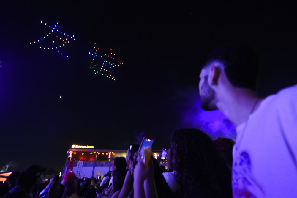 2024年8月17日,在巴西首都巴西利亞,人們在沙灘藝術節中國日活動上觀看無人機表演。