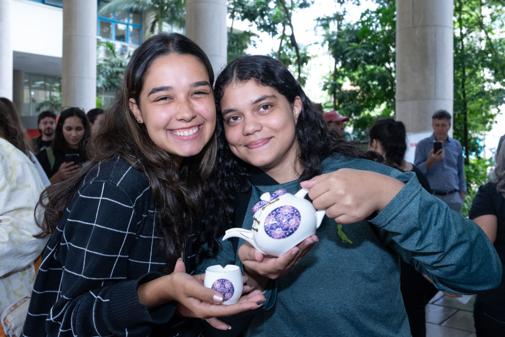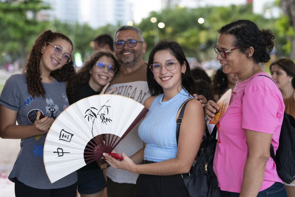 2024年4月18日,在巴西里約熱內盧舉行的聯合國中文日活動上,巴西學生手持中國工藝品合影。