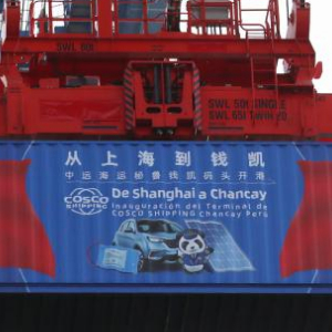 11月14日,在秘魯首都利馬以北的錢凱港,岸邊智能化設備吊裝集裝箱。 新華社記者李夢馨攝