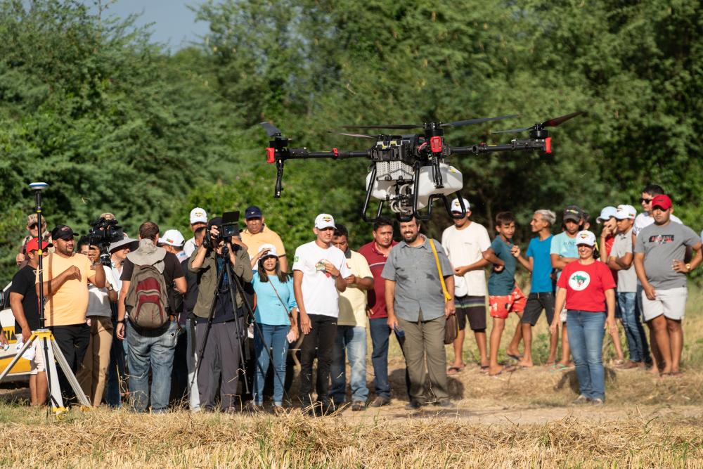 2024年2月2日,在巴西阿波迪,人們觀看一款中國生產的農用無人機。當日,中巴農業機械化合作示范項目啟動儀式在巴西阿波迪舉行,第一批來自中國7家農機企業共31臺(件)設備正式交付給巴西農村勞動者組織。新華社記者 王天聰 攝